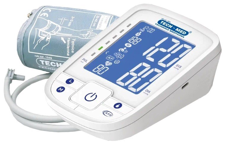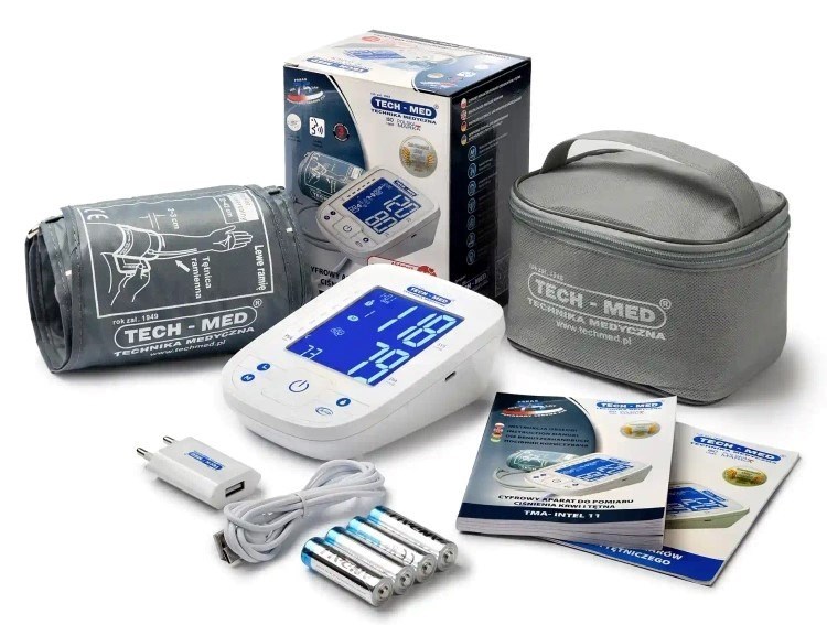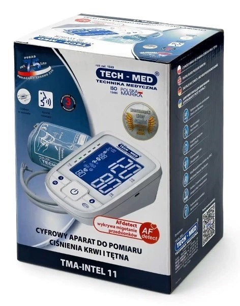 Nowoczesny ciśnieniomierz TMA-INTEL 11 marki TECH-MED z funkcją mowy umożliwia dokładny pomiar ciśnienia krwi oraz wykrywanie migotania przedsionków (AF). Automatycznie wykonuje dwa pomiary, zwiększając precyzję i bezpieczeństwo użytkownika.